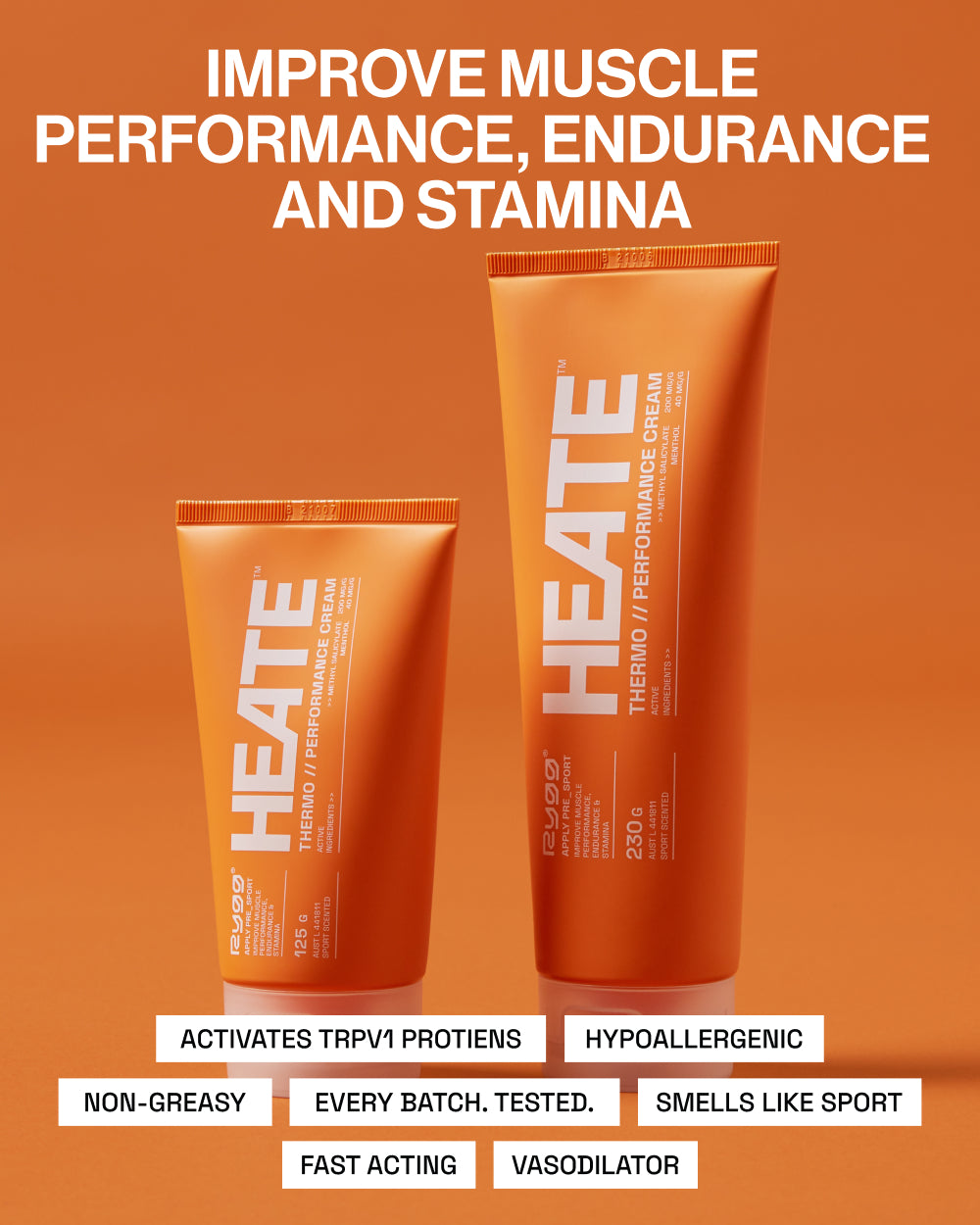 Engineered to ignite, Rygg HEATE™ Thermo Performance Cream has been formulated to play a pivotal role in your pre-sport ritual. Equipping athletes and individuals with a potent blend of menthol and Methyl Salicylate in a quick-drying and fast-acting formula. Improve muscle performance, endurance and stamina with Rygg HEATE™.
